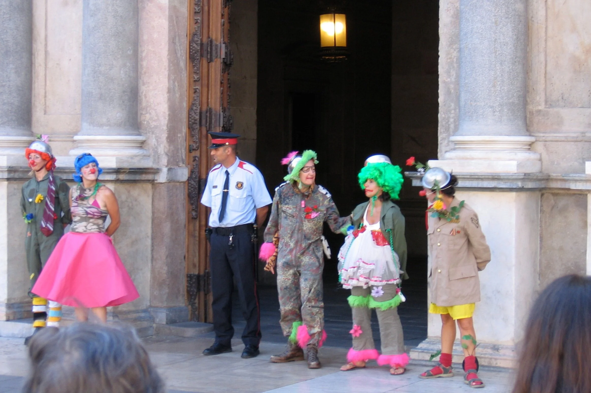 The rebel clown also ruptures the pattern of making demands and threats that can be blocked. Instead, she asks permission and offers the opportunity for collaboration; having set themselves up in physical opposition to the clowns, the “authorities” have become a captive audience and are complicit in the clown's actions. They are caught in the uncomfortable position of being coerced to be part of the “show.” They are working with the clowns who are thus in a powerful position since the clown thrives on attention. This is most obvious when clowns are being searched by the police. Police and army strategy is built around predictability and knowing what the “enemy” will do next - but how can the police know what will happen when they decide to strip search a gaggle of rebel clowns? How can they know that half of them are likely to dissolve in hysterical giggles because they are ticklish while the other half have so many layers of clothing that it will take all day before they are down to their stripy underwear?